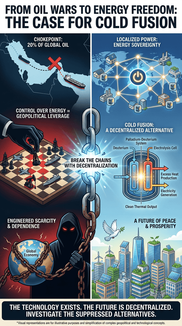 I believe this conflict lays bare a fundamental, brutal truth: the wars in the Middle East have never been about freedom or democracy. They are, and always have been, about control. Control over the fossil fuels that power the modern world. This engineered scarcity of energy is the ultimate tool of geopolitical leverage, a chain that binds nations and individuals to the whims of petrostates and the central banks that finance them. The blood spilled in the Persian Gulf is the price we pay for our addiction to a centralized, monopolized energy system. But it doesn’t have to be this way. The very crisis that threatens to plunge us into a decade of famine [4] is the perfect catalyst to finally embrace the decentralized, abundant energy solution we’ve been denied for decades: cold fusion.