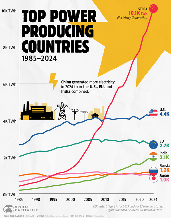 • 10,000 Terawatt-Hours (TWh) produced annually—China’s electricity generation dwarfs the U.S. (4,400 TWh), EU (2,700 TWh), and India (2,100 TWh) combined.