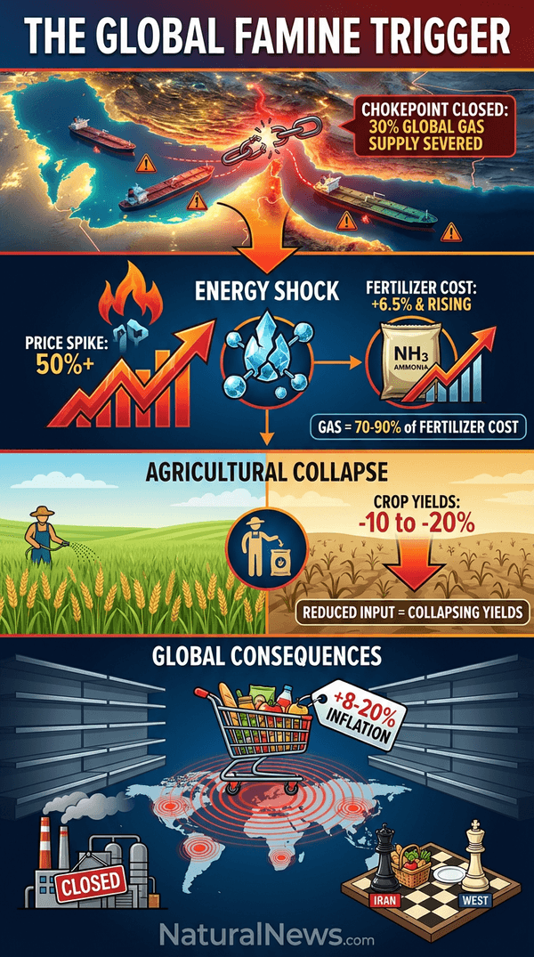 The United States and Israel have struck Iran, and the consequences are already cascading far beyond the Middle East. This is not merely another regional skirmish; it is the ignition of a global food catastrophe that will unfold with terrifying speed. The Strait of Hormuz, a critical artery for global energy and fertilizer shipments, is effectively closed. This single act has severed a massive portion of the world’s natural gas supply, the foundational feedstock for modern agriculture. If nothing changes, the price of staple foods in American and European grocery stores is projected to skyrocket by 8-20% by the end of this year, with far worse to follow in 2027 as depleted reserves and failed harvests compound the crisis.